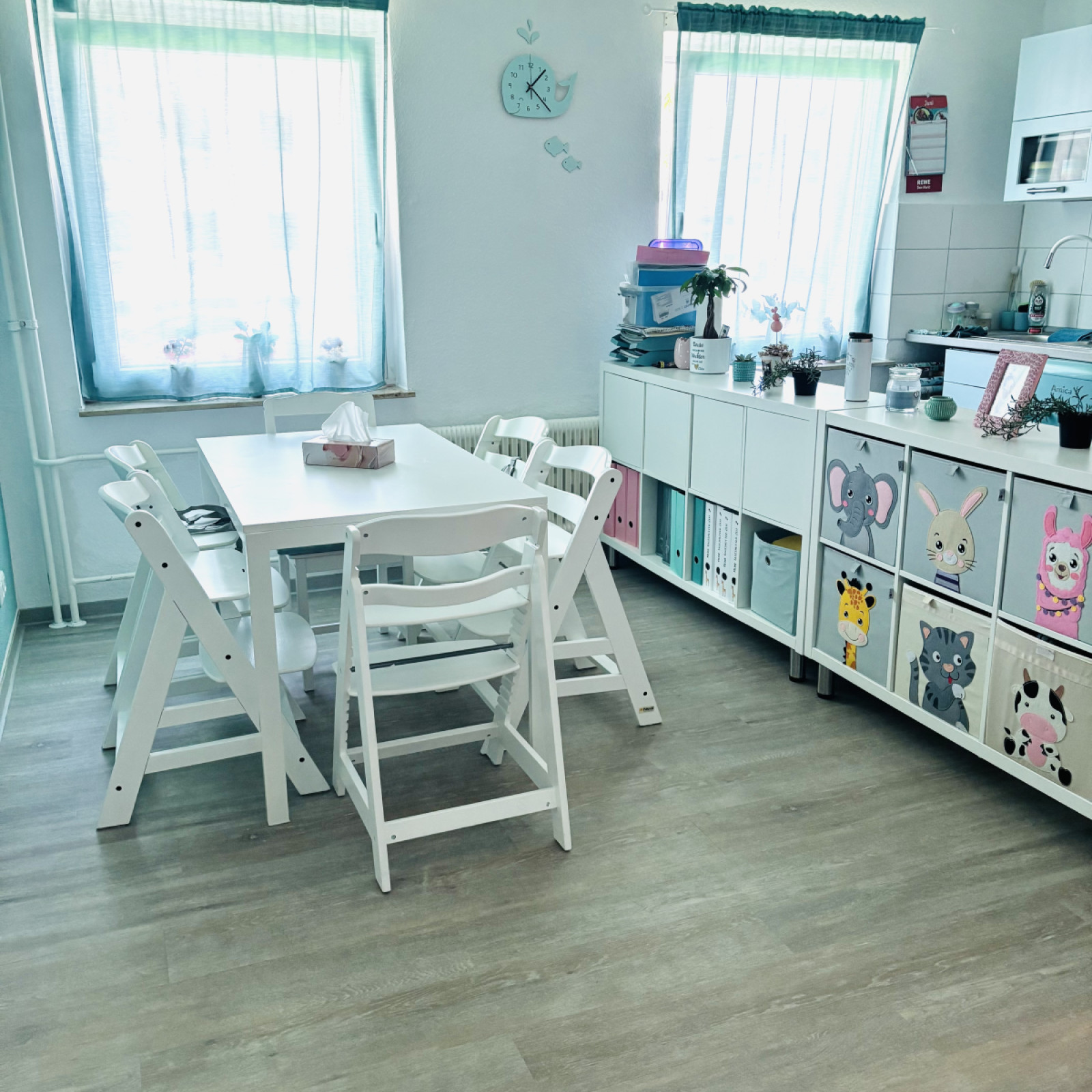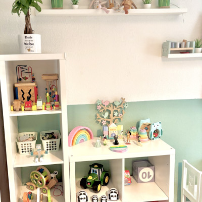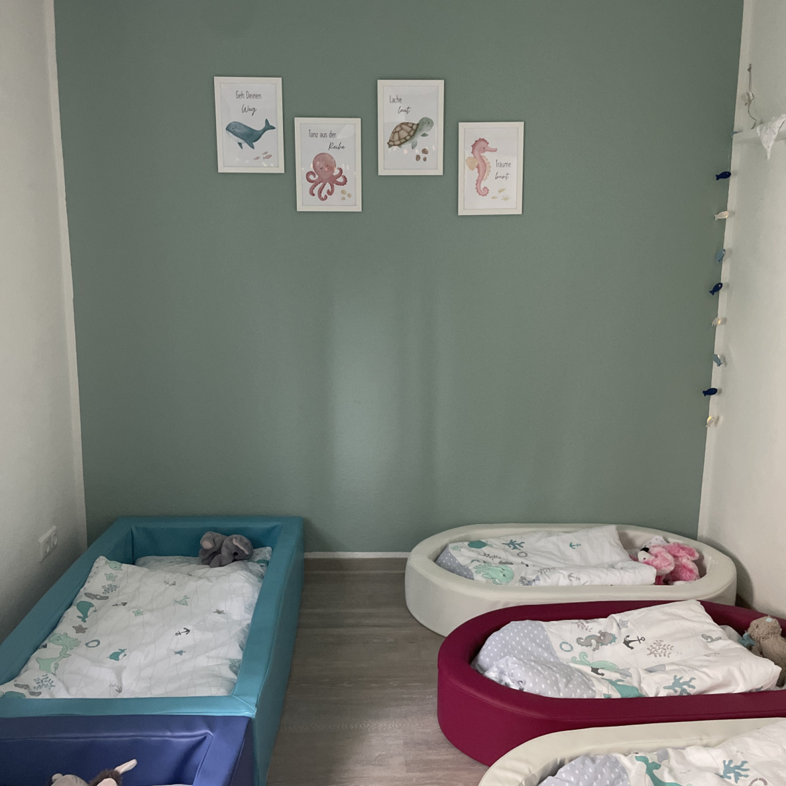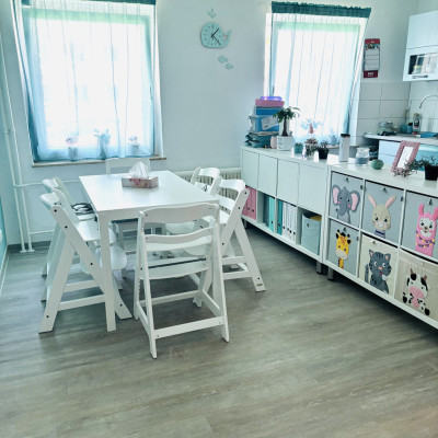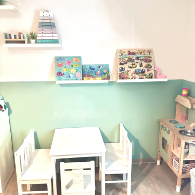 Es gibt ein großes Spielzimmer zum Toben, ein kleines Zimmer für den Mittagsschlaf oder um sich auszuruhen mit eigenen Bett für jedes Kind, was auch als Lesebereich genutzt werden kann, wenn nicht geruht wird.